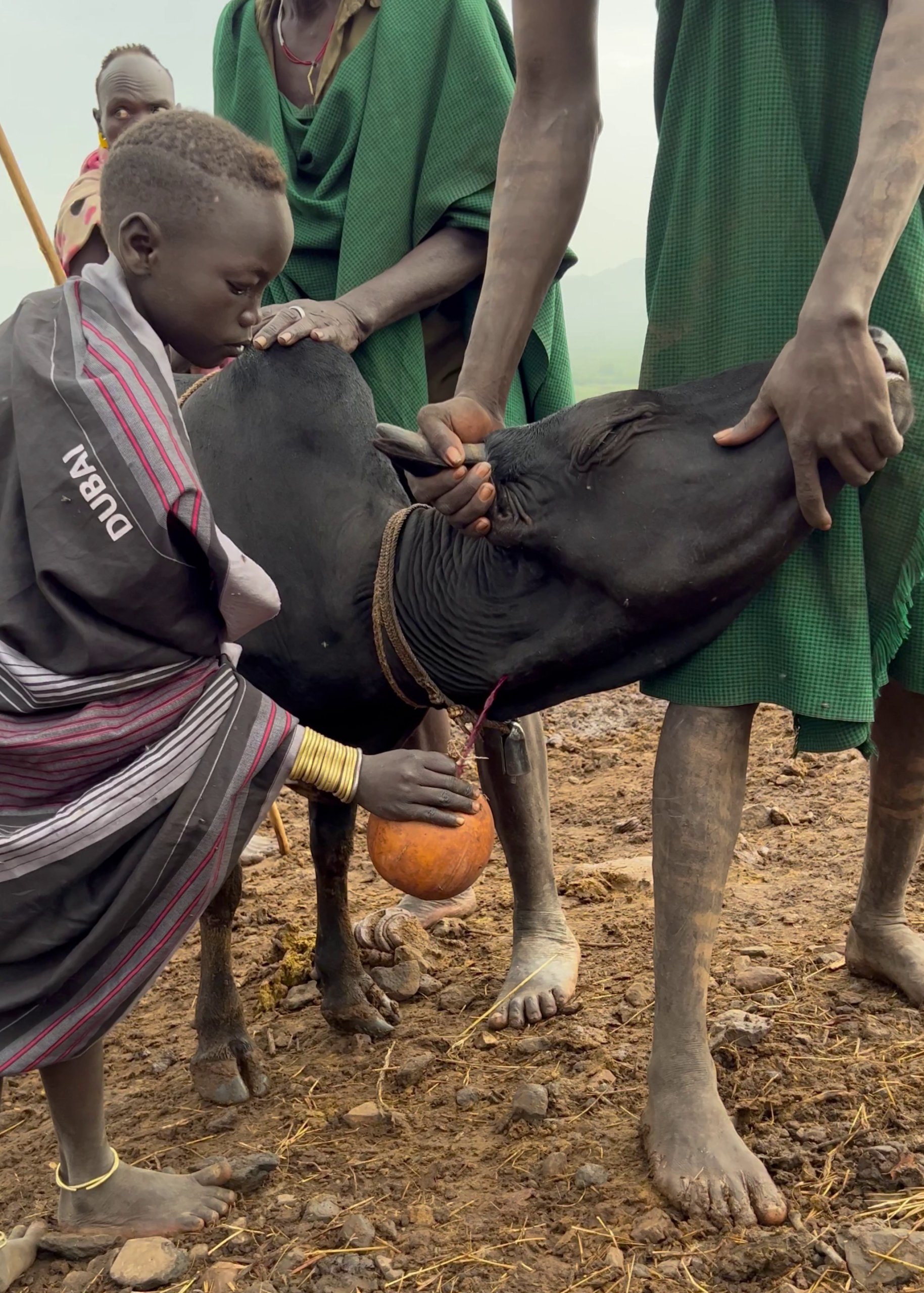 El proceso es sorprendente: entre varios hombres inmovilizan a la vaca y le colocan un torniquete suave en el cuello, lo suficiente para resaltar una arteria. Luego, con una pequeña flecha, perforan esa arteria y extraen entre uno o dos litros de sangre en un cuenco hecho de calabaza.