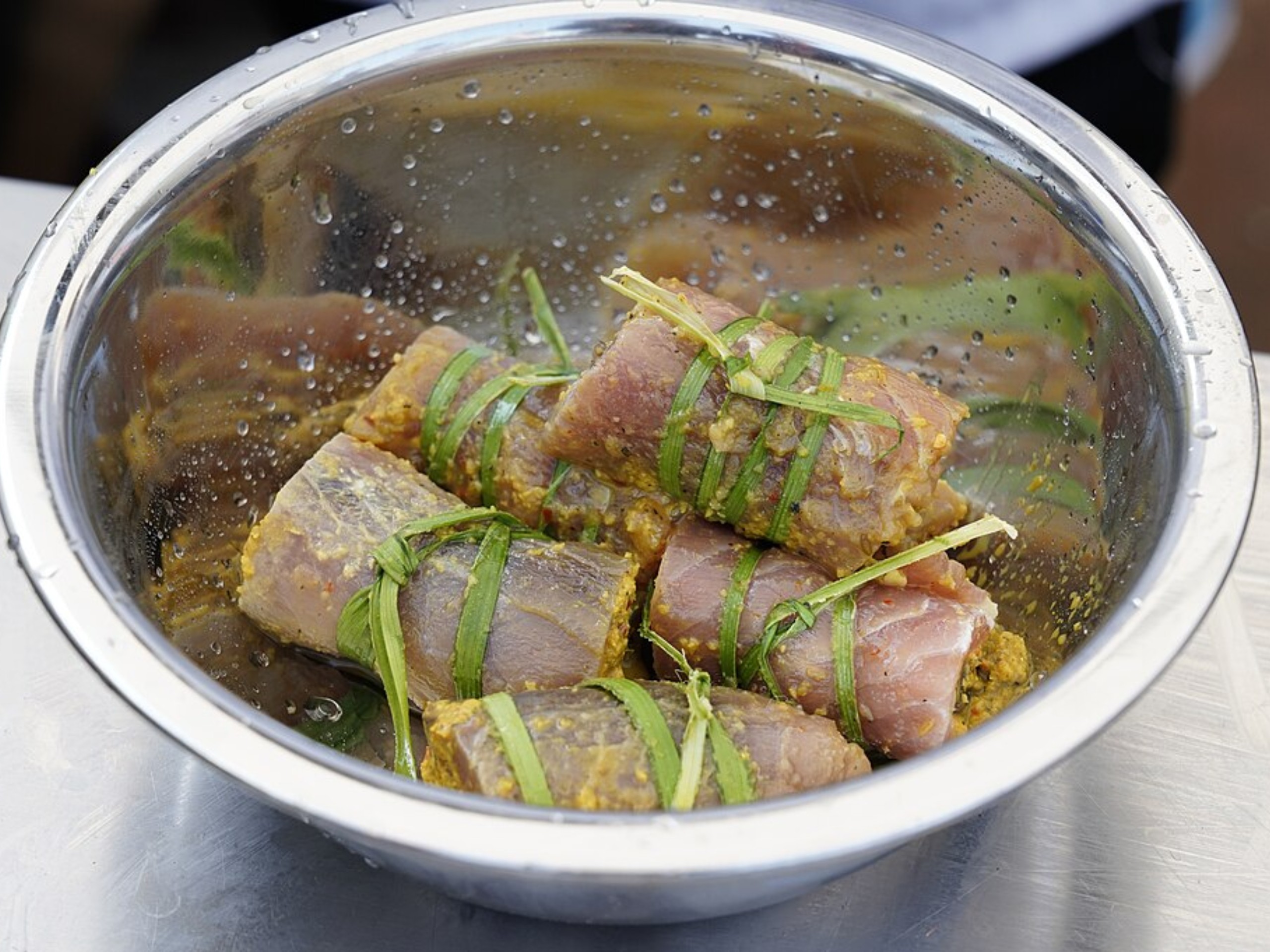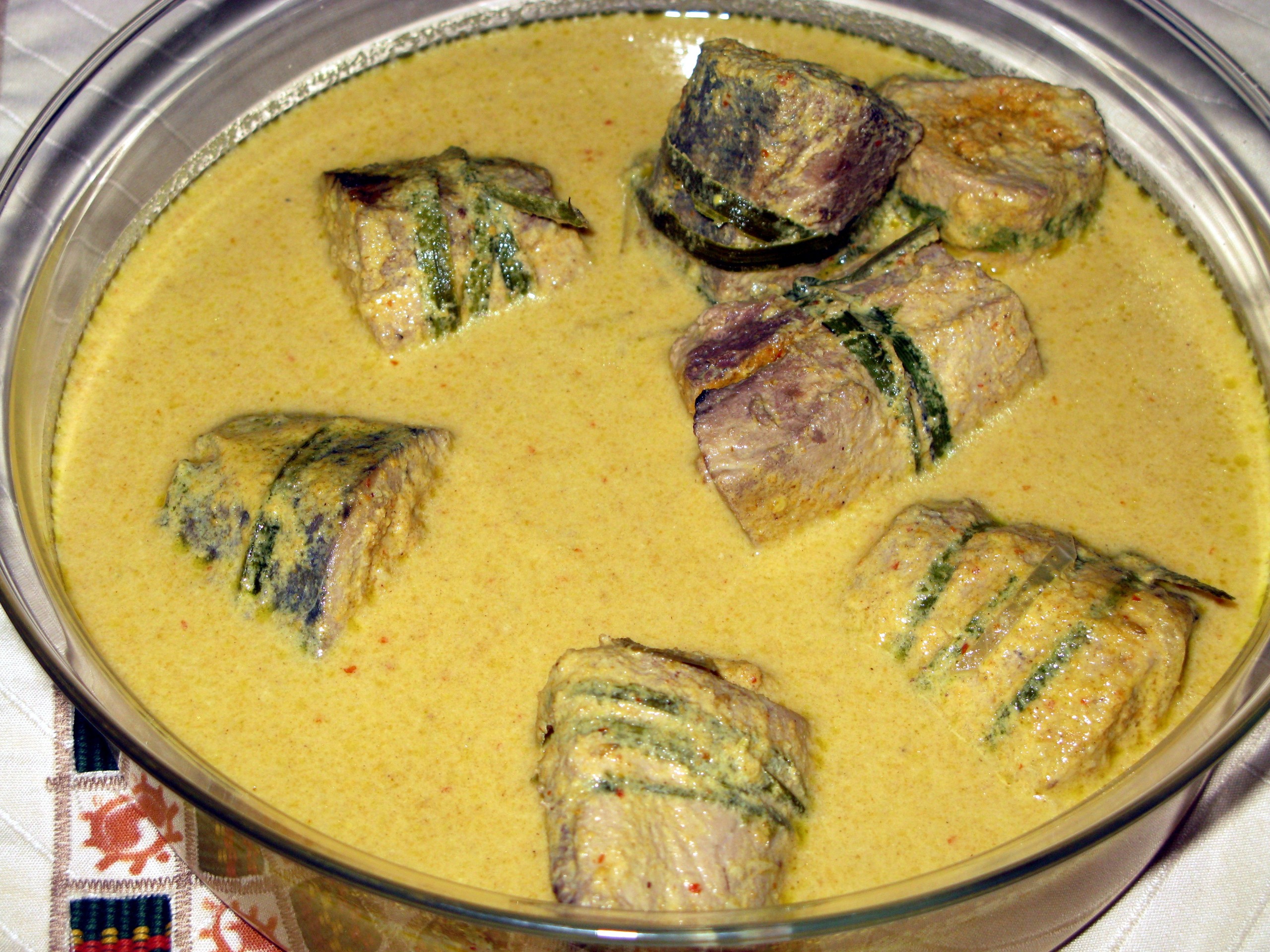 Un curry de atún muy particular. Los filetes se enrollan en especias, se atan con hojas de coco y se cocinan lentamente en leche de coco. Su nombre significa “pollo del mar” (literal).